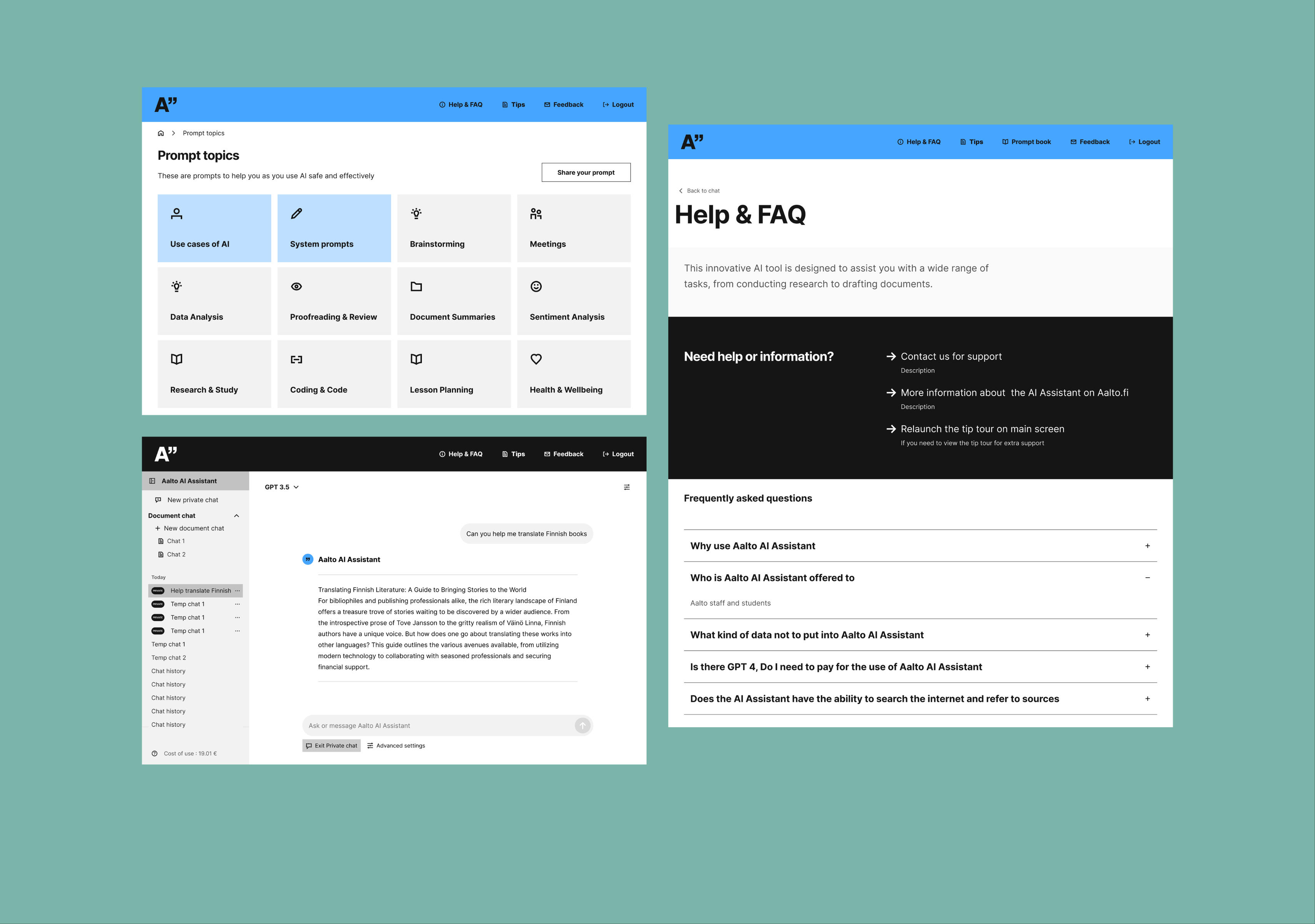 The Aalto AI Assistant project involved extensive collaboration across multiple teams. I worked closely with the team at Silli, including their developers and UX designer Amy, to align on the technical and design requirements. Collaboration also extended to Aalto University’s IT department, which had developed the original implementation of the assistant, ensuring the redesign addressed prior limitations.The main UI design work was a joint effort between Amy and myself. We developed multiple pages of the product. These designs were then reviewed and refined during collaborative sessions with the Aalto team, incorporating feedback through iterative sprints. This cross-team collaboration was vital in delivering a cohesive, user-focused solution.