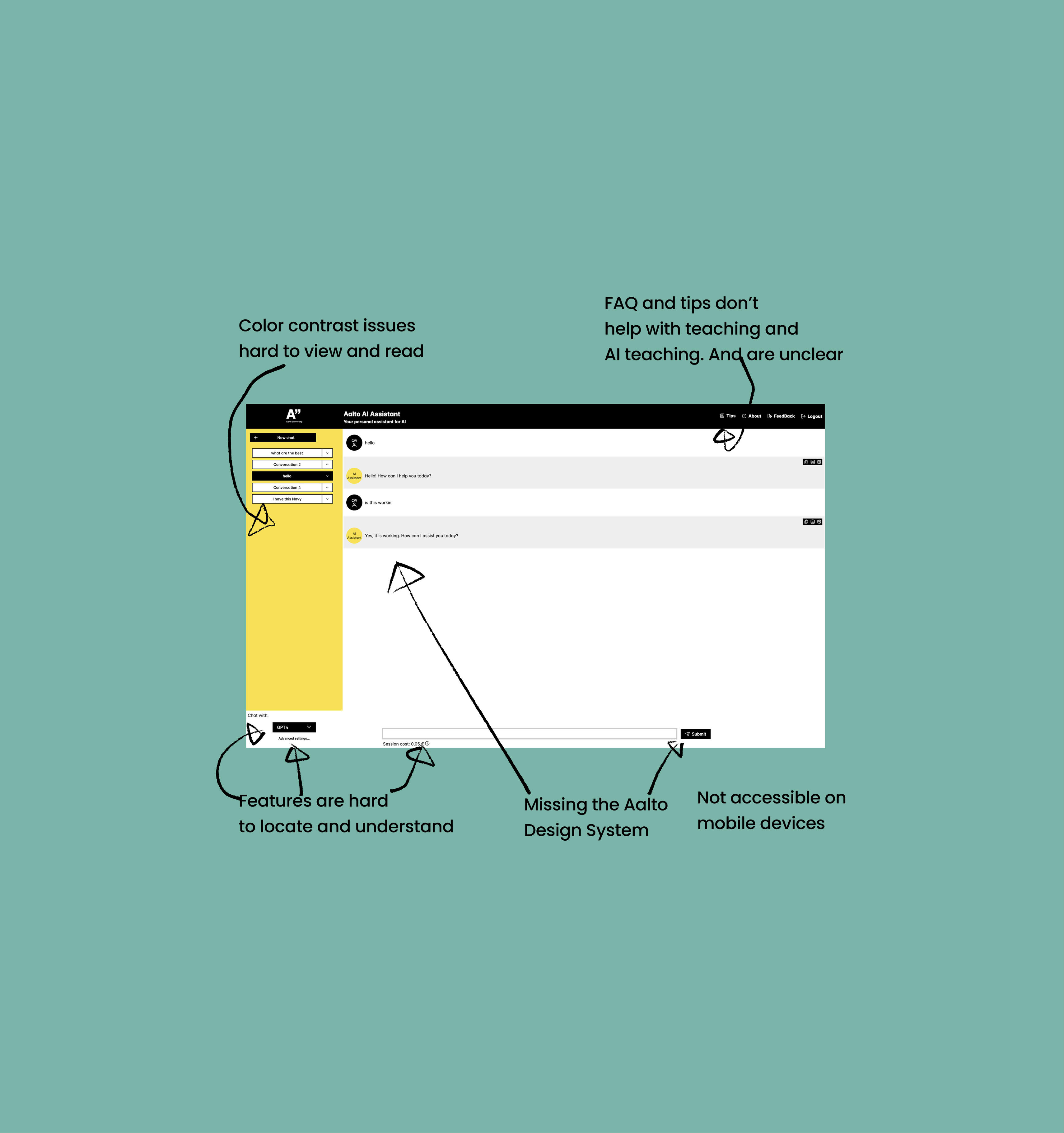 Accessibility Testing & Key FindingsTo improve the Aalto AI Assistant, I conducted a detailed accessibility evaluation using the Information Architecture Heuristics checklist. This testing revealed key issues, including limited mobile usability, difficulty locating features like chat history, inconsistent UI elements, and unclear instructions. Additionally, the tool was desktop-only, lacked screen reader compatibility, and its dropdown navigation was counterintuitive.By categorizing findings into areas like findability, accessibility, and communication, I developed actionable recommendations. This included optimizing the interface for mobile use, aligning the design with Aalto’s broader ecosystem, enhancing visual clarity, and streamlining navigation. These improvements addressed pain points and ensured a more accessible and user-friendly experience for staff, students, and researchers.