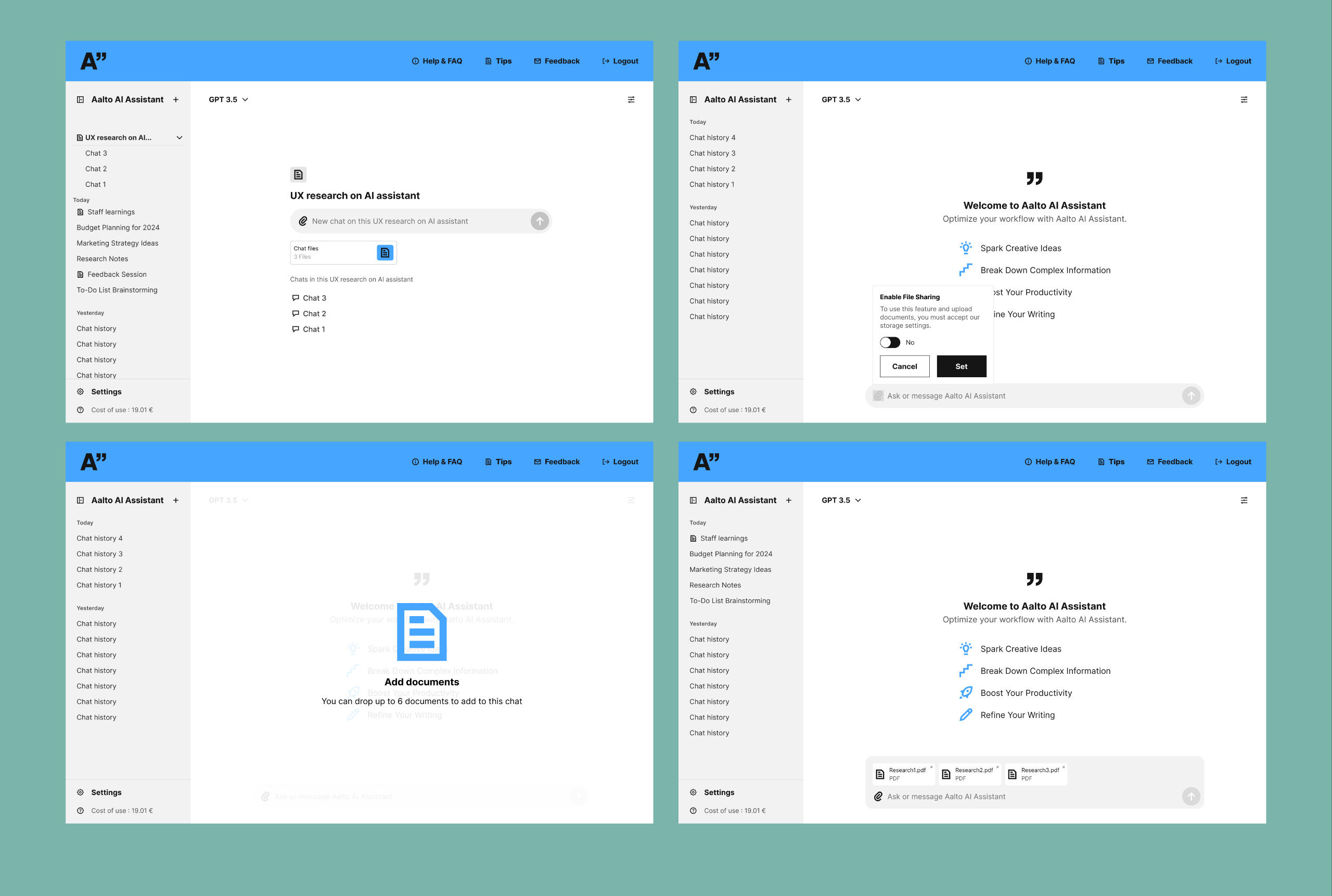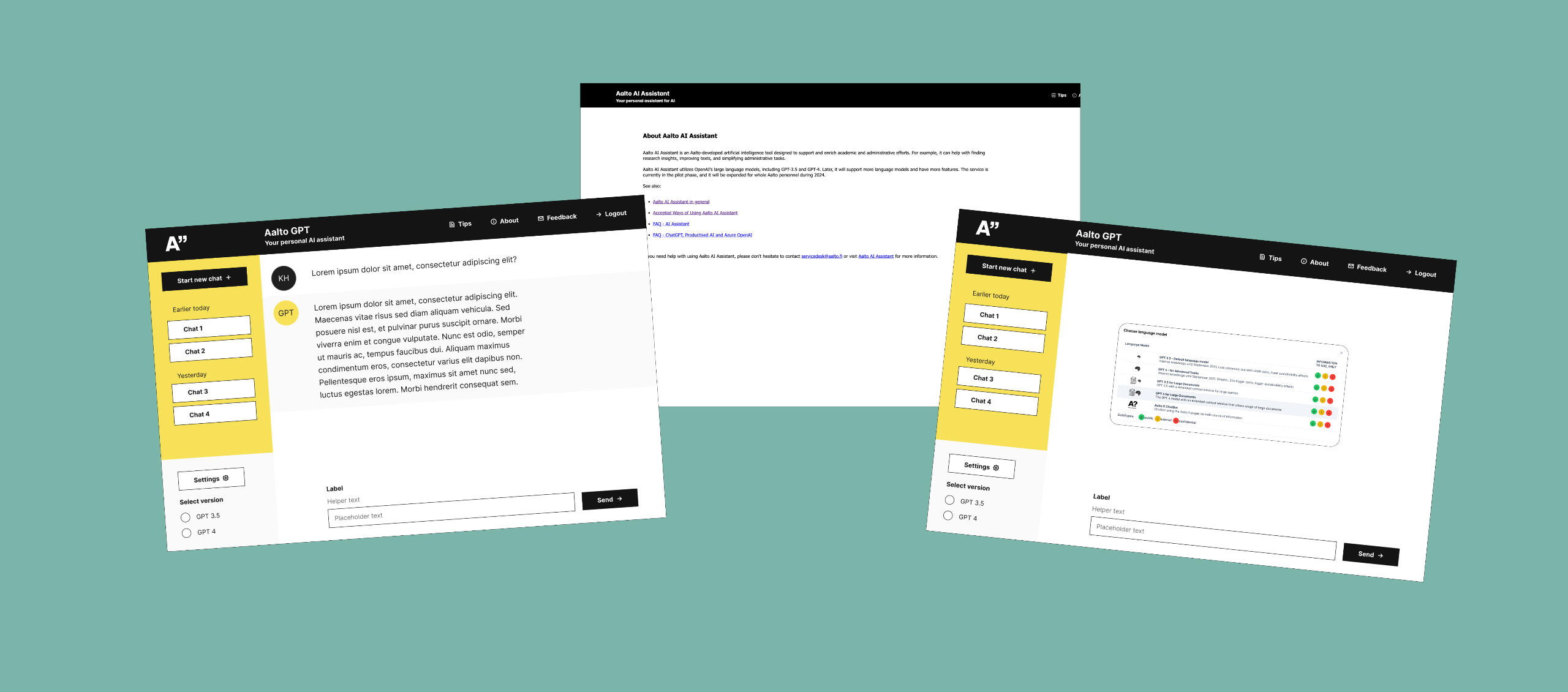 The design decisions for the Aalto AI Assistant focused on simplifying the user flow to create a more intuitive experience, while aligning with tools the staff already used. This approach minimized learning curves and ensured seamless integration into their daily workflows.Aalto prioritized this tool as a secure platform for handling sensitive university data, making it critical to design a product that staff would trust and adopt. To further support this goal, the tone of speech and tips section was intentionally made friendlier and more approachable, helping guide staff members who might be unfamiliar with tools like GPT.
