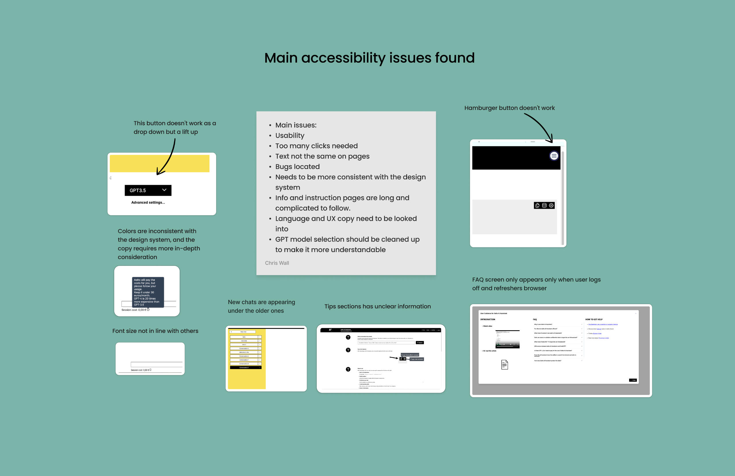 The existing AI tool wasn't just unpopular; it was a liability. Its poor design meant students and staff were abandoning it for public AI models like ChatGPT, exposing sensitive university data and creating a significant security risk.My initial audit uncovered why this was happening:1. Business & Legal Risk The tool failed to meet Aalto's standards as a top technology university. More critically, it was not compliant with the upcoming European Accessibility Act (EAA), putting the university at legal risk and failing its public sector obligations.2. Core Product & Accessibility Failures A heuristic and accessibility audit revealed the tool was unusable for many. It was inaccessible to screen readers, failed WCAG color contrast ratios, and had a confusing, multi-click navigation.(This is the perfect place to show your "before" screenshots, annotated with these problems.)Key Audit Findings (from user feedback & testing):