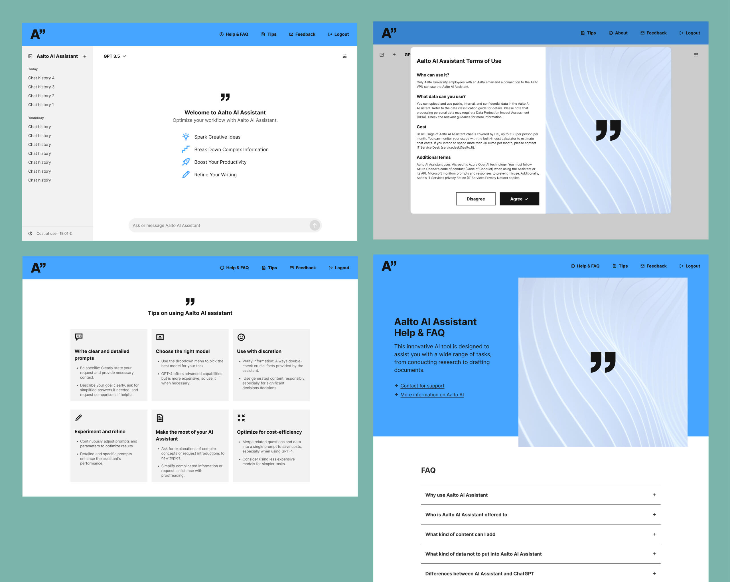 The Aalto AI Assistant project involved extensive collaboration across multiple teams. I worked closely with the team at Silli, including their developers and UX designer Amy, to align on the technical and design requirements. Collaboration also extended to Aalto University’s IT department, which had developed the original implementation of the assistant, ensuring the redesign addressed prior limitations.The main UI design work was a joint effort between Amy and myself. We developed multiple pages of the product. These designs were then reviewed and refined during collaborative sessions with the Aalto team, incorporating feedback through iterative sprints. This cross-team collaboration was vital in delivering a cohesive, user-focused solution.