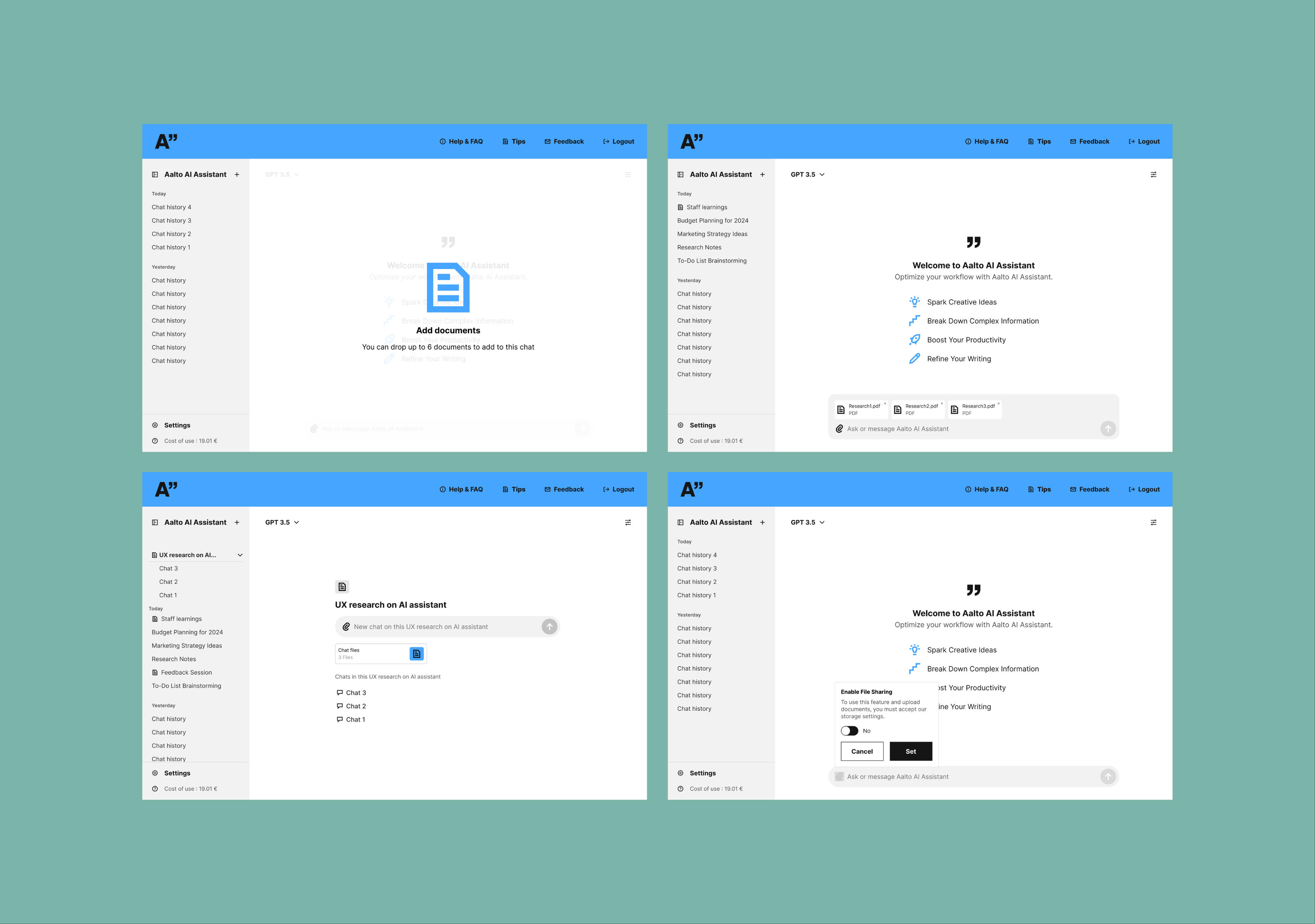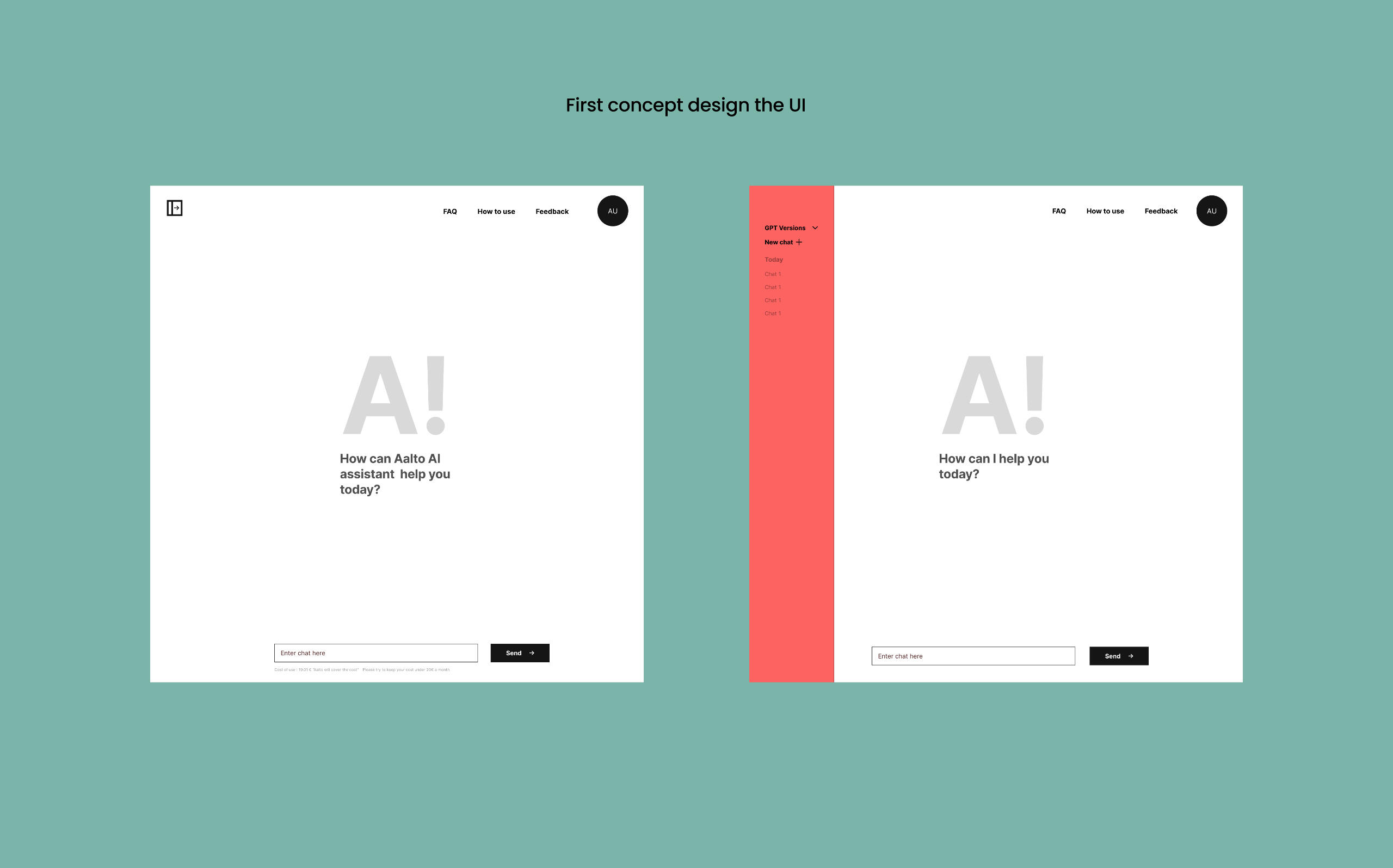 To kick off the redesign, I started with early sketches to explore potential solutions. I benchmarked similar chatbot tools to identify best practices and gain inspiration for improving the Aalto AI Assistant. At the same time, I engaged with the university community to understand which features they found most essential, ensuring the redesign would align with their specific needs and expectations.The initial designs were created to present at the first design review, focusing on key improvements identified during the research phase. At this stage, Amy from Siili joined the project, bringing valuable insights into the UI requirements. Her input helped refine the direction of the design to ensure it aligned with both user needs and technical constraints.