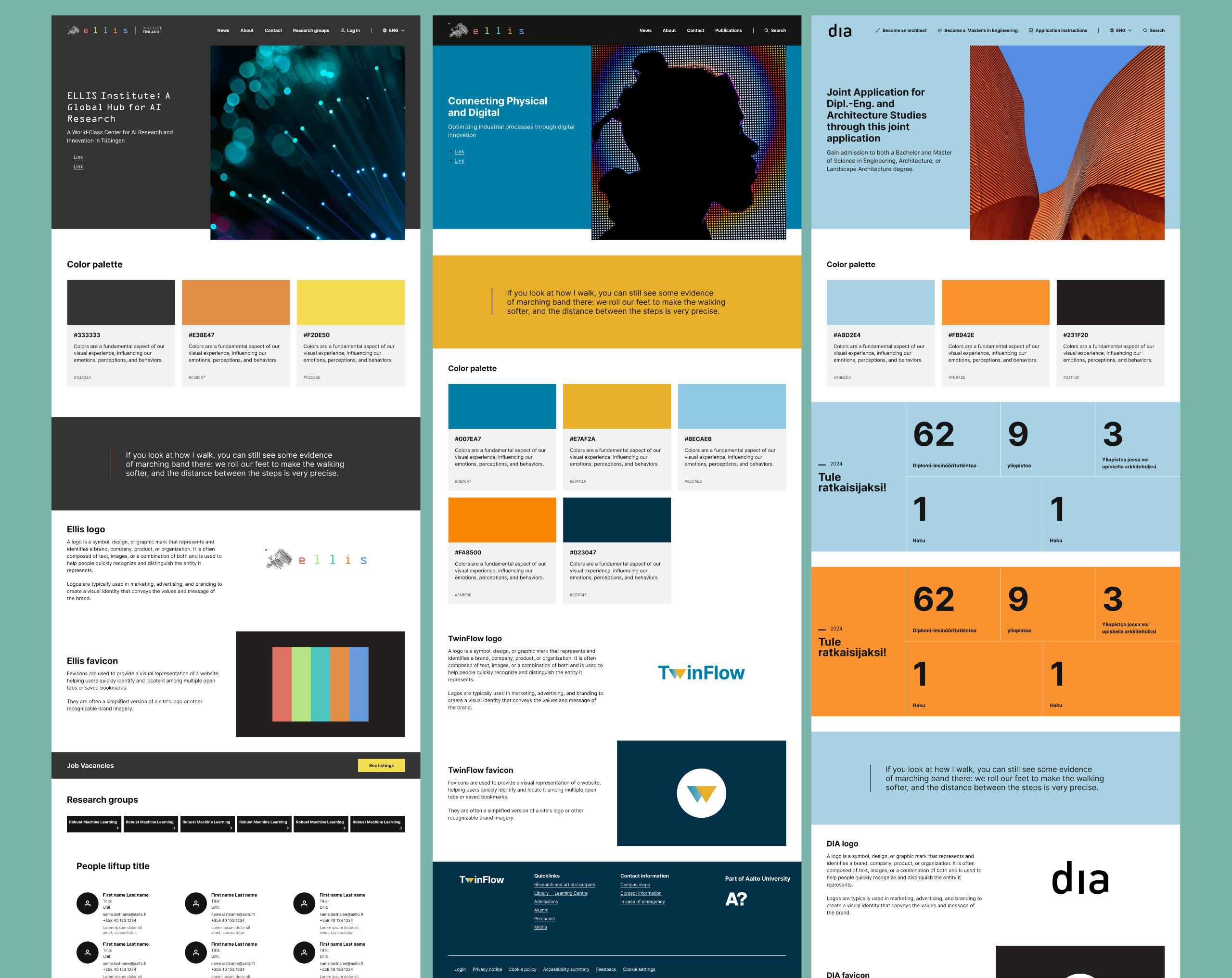 Each project site is a careful blend of stakeholder branding and Aalto University’s design system. Using examples of brand colors, logos, and favicons, I demonstrate how diverse aesthetics are integrated seamlessly into the Aalto.fi platform. While the designs must align with Aalto’s cohesive framework, they also preserve the unique identity of each brand.This balance requires adapting stakeholder assets to fit Aalto’s design guidelines without compromising their distinct style. By navigating these challenges, I create sites that are visually harmonious yet true to the stakeholders’ vision.